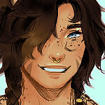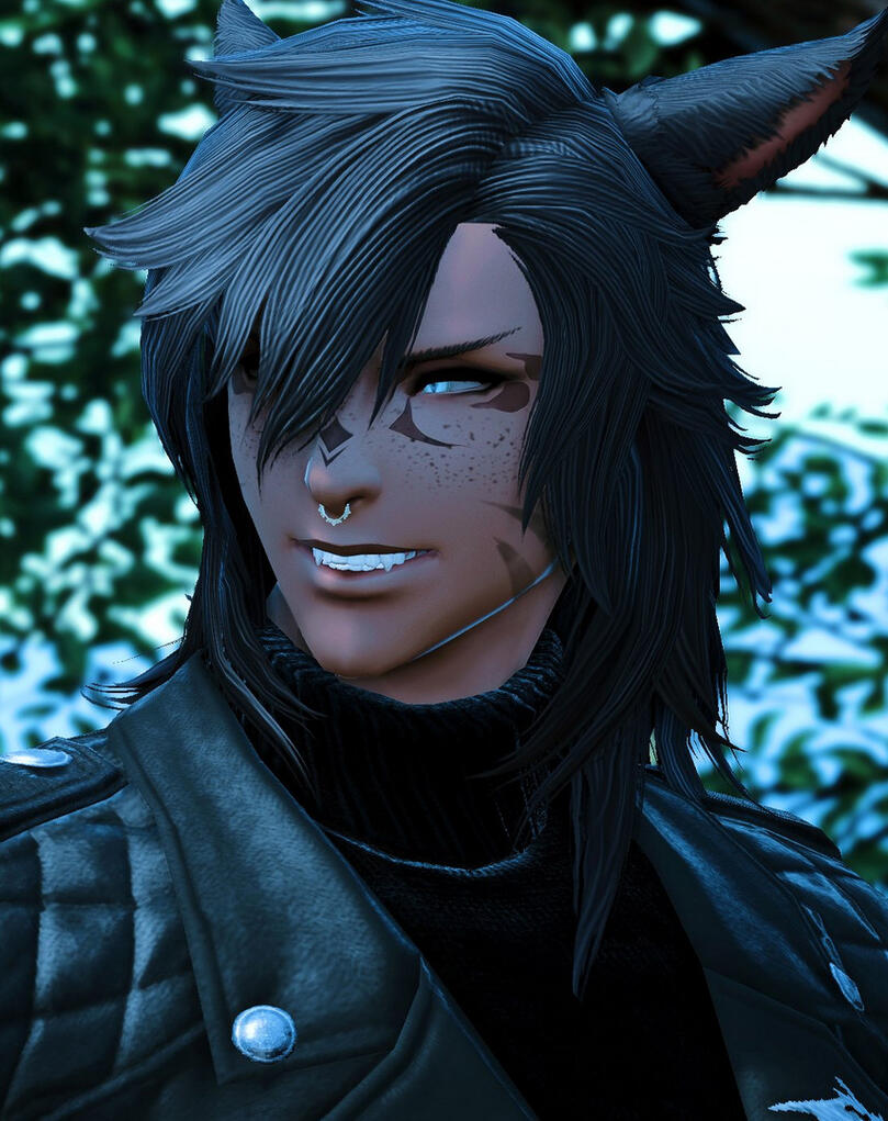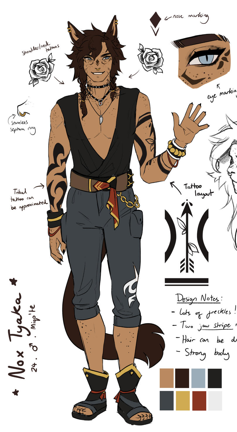 Physically strong and unusually tall for a Miqo'te due to distant-Hyuran lineage, Nox sits at 5'10 and 190lbs. With a very broad chest, strong arms, and narrow hips; his form is triangular and toned.Gently-tanned skin is adorned with dapples of freckles, and an archery-themed tattoo sits on his left arm, accompanied by a tribal sleeve on his right. Two rose tattoos sit symmetrically on his neck, leaves branching onto his collarbones. His dearest, though, is the one that sits on his nose bridge -- a traditionally Viera marking, given to him by his mentor and older sister figure, Fae. Two gold rings are pierced through each ear, with a matching gold septum ring in his nose.His tail is long and soft, and his bright, ice blue eyes are near-always accompanied by a slightly fanged smirk sat atop his lips. Umber hair stays charmingly unkempt; ever so slightly frazzled from the sea salt & sun rays, so is most often braided, as it will fluff outwards if not. Other blue hued greys & dark neutrals are common throughout his wardrobe, comprised of easy, practical, and breezy shirts. He didn't sit through those tattoos for nothing, after all.--Once one gets past the initial intimidation factors, Nox is more akin to a lap cat than a guard dog; he's a real softie at heart, with a penchant for found family. If he likes you & you need help, he will drop anything on his plate to do so. He laughs loud and brazenly, his voice medium-deep with a gentle rasp.He deeply enjoys spending his leisure time basking in the sun, fishing & sketching, so he can most often be found at the docks doing just that in his downtime. A former pirate with a close Maelstrom eye on his head, he finds himself working as a bartender & bouncer, and helping run Fae's inn to keep his profile low. That doesn't stop him from doing the odd black market deal every now and then for cheaper liquor, though.